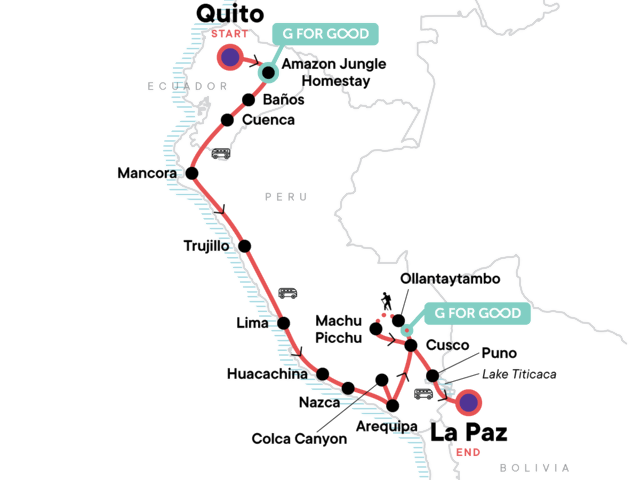 Experience traditional life in a local community in the Amazon, witness colonial cities and volcanoes, Sandboard the dunes of Huacachina., spot condors at Colca Canyon, conquer the Inca Trail to Machu Picchu, settle in with the locals at a homestay on Lake Titicaca, Get adventurous in Baños, relax on the beach with free time in Mancora.