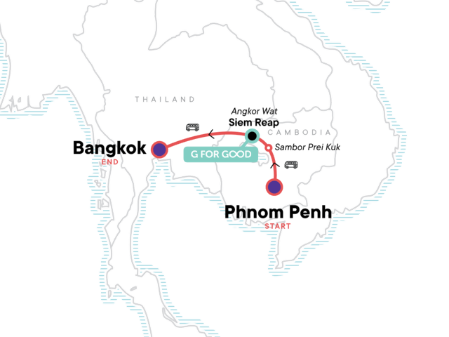 Your Welcome Moment: Welcome Moment - Meet Your CEO and Group. Phnom Penh cyclo tour and dinner at Friends International. Visits to Skun Market and Santuk Silk Farm. Tour of Sambor Prei Kuk Anicent Site. Visit Rong Klua Market. Visit Wat Sothorn Wararam Woraviharn. Walk and night out on Khao San Road. All transport between destinations and to/from included activities.