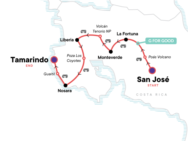 Your Welcome Moment: Welcome Moment - Meet Your CEO and Group. Visit to Poás Volcano. Tortilla-making lesson and typical lunch at Mi Cafecito community project. Zip-lining in Monteverde. Hike to Rio Celeste Waterfall in Volcán Tenorio National Park. Walk to a waterfall and swim in Poza Los Coyotes. Excursion to Playa Guiones from Nosara. Pottery demonstration in Guaitil. Surf Lesson at Tamarindo. Orientation walks in La Fortuna, Monteverde, and Liberia. All transport between destinations and to/from included activities.