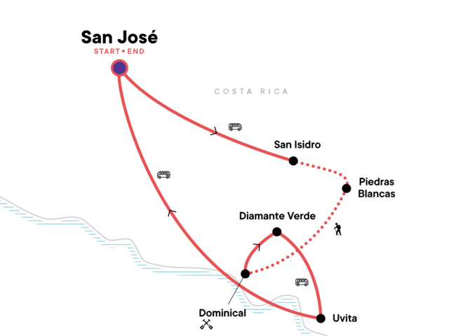 Your Foodie Moment: Chocolate Making, Piedras Blancas. Hiking excursion to Piedras Blancas (4 days). Overnight hiking excursion to Diamante Verde Cave. Waterfall rappelling. Whitewater rafting on the Savegre River. Trapiche demonstration. Ballena Marine National Park visit. Free time in Dominical and Uvita. All transport between destinations and to/from included activities.